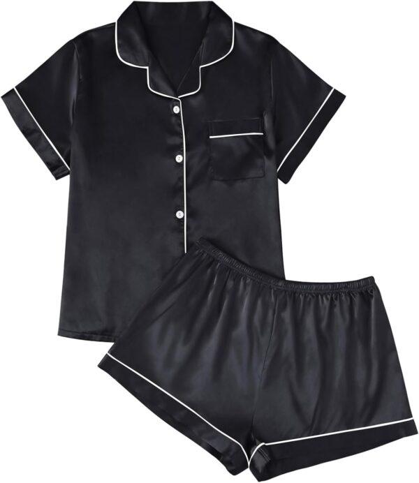 • Features: The relaxed fit two-piece comfortable sleepwear pajama set features silky shorts with elastic waistband and matches a silky-smooth short-sleeve V-neck top with a chest pocket, notch collar and the button-front top hits at hips. The sleepwear set are soft and elegant, to giving you a lazy sleep.
